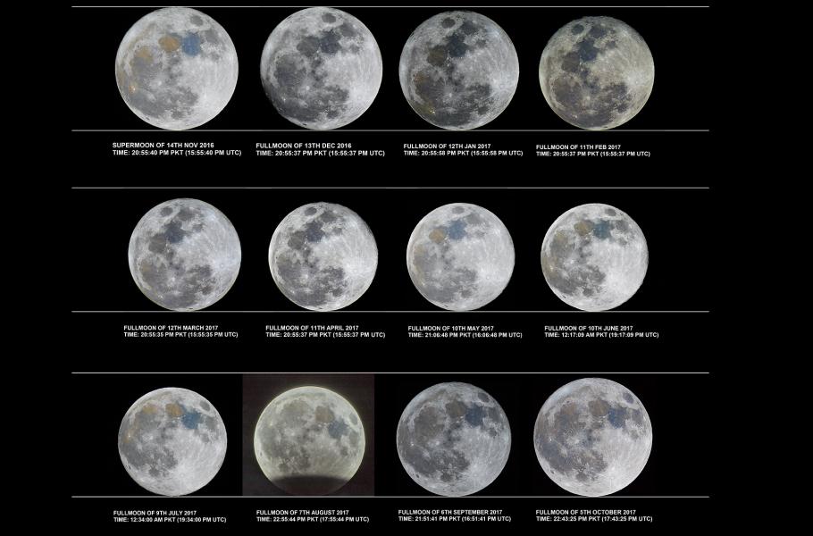Vypadají všechny úplňky stejně? Ani zdaleka ne. Jak ukazuje roční přehlídka úplňků zachycených z území Pákistánu od listopadu loňského roku, každý z úplňků je mírně odlišný. Jednotlivé měsíční kotouče jsou zobrazené ve stejném měřítku, jejich rozdílná velikost je dána různou vzdáleností Měsíce od Země díky jeho výrazně nekruhové oběžné dráze. Tmavá šmouha u úplňku ze srpna 2017 je stín Země při částečném zatmění Měsíce