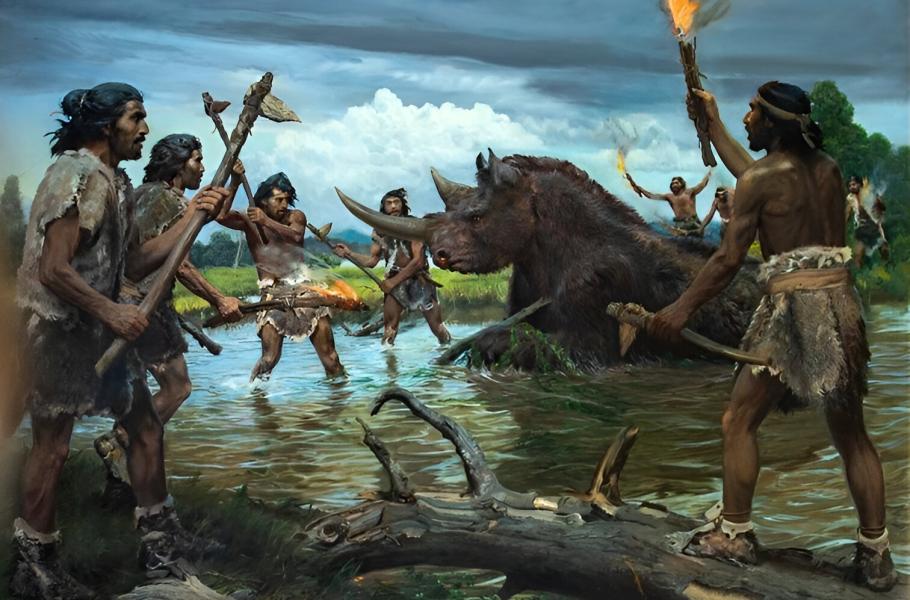 Obraz Zdeňka Buriana znázorňující lov na srstnatého nosorožce z doby pravěku. (foto: Profimedia)