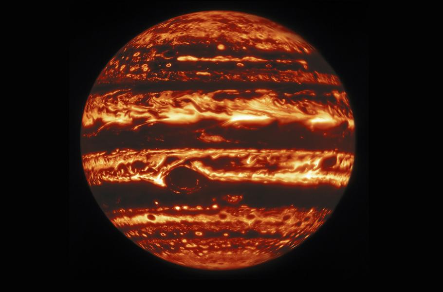 Jupiter v infračerveném spektru vyzáří víc energie, než od Slunce přijme. (foto: International Gemini Observatory/NOIRLab/NSF/AURA, M.H. Wong, CC BY-SA 4.0)
