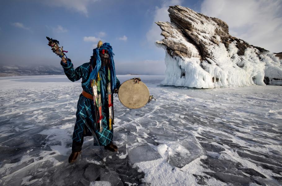 Sibiř představuje jednu z mála oblastí světa, kde dosud přežívá šamanismus – a v centru tamní víry stojí posvátné jezero Bajkal. Fotografie ukazuje šamana Vitalije z Burjatska, jak se při rituálu snaží spojit s duchy zamrzlých vod. (foto: TPOTY, Athanasios Maloukos)
