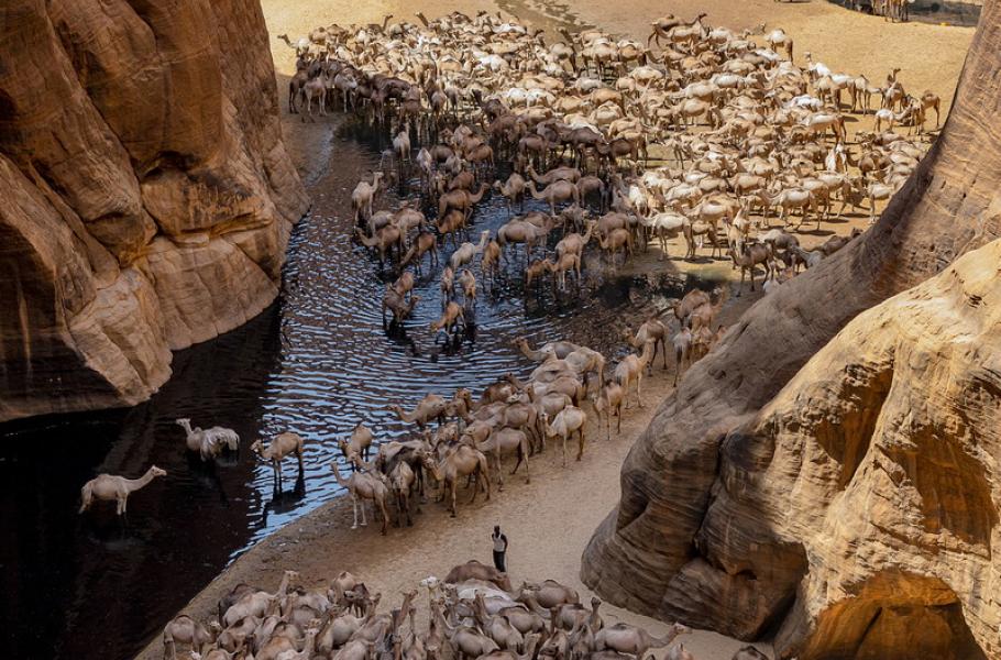 Čadská oáza Guelta d’Archei patří k tradičním zastávkám nomádů, kteří vedou svá stáda dromedárů pouští Ennedi. Každý den tam přicházejí stovky žíznivých zvířat a jejich trus barví vodu do černa. (foto: TPOTY, Johan Gerrits)