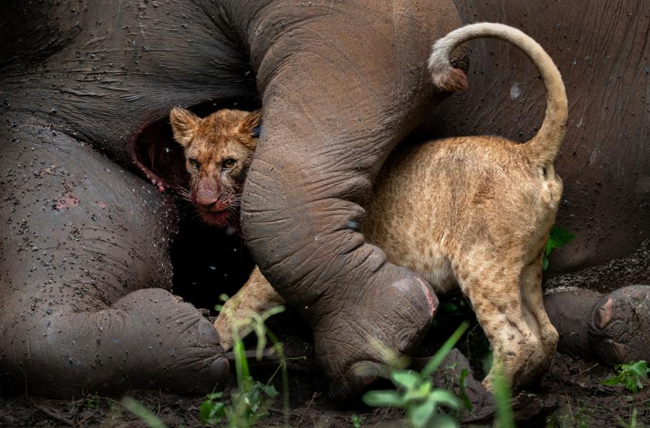 V tanzanském národním parku Tarangire sužovaném suchem se lví smečce podařilo udolat slonici. Šelmy si tak zajistily cennou potravu na několik dní. Roie Galitz zachytil jejich hostinu v okamžiku, kdy už na kořisti hodovaly také mouchy a v dáli nejspíš vyčkávali mrchožrouti. (foto: TPOTY, Roie Galitz)