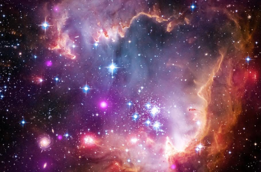 Kombinovaný snímek otevřené hvězdokupy NGC 602 obklopené mlhovinou zahrnuje údaje ze tří největších kosmických observatoří NASA: Fotografii mlhoviny pořízenou Hubbleovým teleskopem doplňují data z rentgenové observatoře Chandra a z infračerveného vesmírného dalekohledu Spitzer. Stáří NGC 602 se odhaduje na pouhých pět milionů roků, přičemž intenzivní záření jejích mladých stálic působí na prach a plyn v okolní mlhovině, což vede k další tvorbě hvězd. Mlhovina s hvězdokupou leží na okraji satelitní galaxie Malé Magellanovo mračno. (foto: NASA/CXC/ESA, CC BY 4.0)