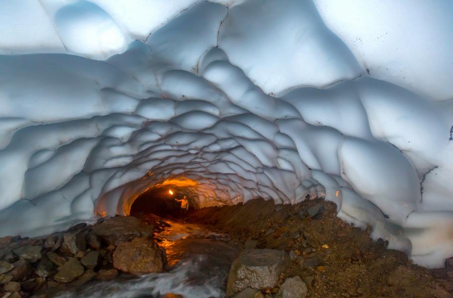Na jihu Kamčatky dokázala příroda vykouzlit jednu z nejpodivuhodnějších ledových jeskyní: Téměř kilometr dlouhý tunel vyhloubil horký pramen protékající pod ledovcovými poli na úpatí vulkánu Mutnovskij. Barevné divadlo na průhledném stropě masivní jeskyně navíc není dílem umělého osvětlení ani počítačové grafiky – vytváří jej lom slunečních paprsků pronikajících do podzemí skrz ledovec.