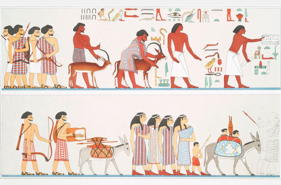 Skupina západoasijských cizinců přinášejících dary faraonovi. Jedná se o Kanaánce, nebo o Hyksósy. Muž vedoucí kozorožce núbijského (uprostřed) je patrně hyksós Abiša.