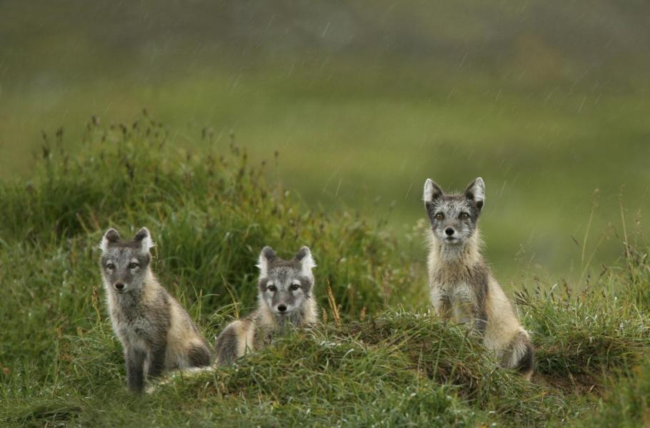 Mláďata polárních lišek v letním období, kdy je relativní dostatek potravy. V zimě se šedá srst zbarví na bílou, takže je šelma na sněhu dobře maskovaná.