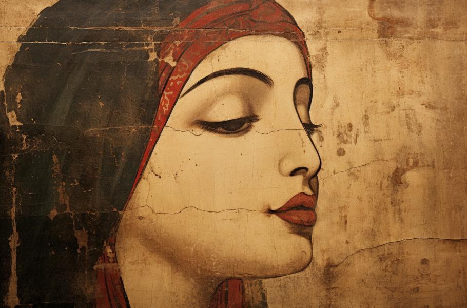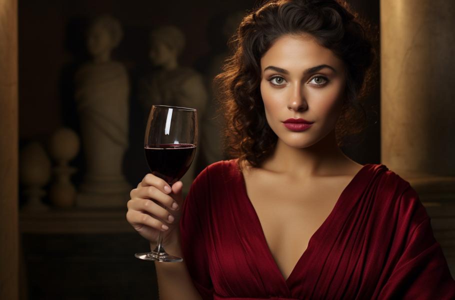 Ve starověkém Řecku své rty zvýrazňovaly zvláště prostitutky. Jejich polibek byl skutečně omamný. Barva na rty se totiž vyráběla ze směsi rudého barviva a silného vína. Ve starověkém Římě si ženy i muži líčili rty směsí rostlinné a rtuťnaté purpurové barvy. (ilustrace: Midjourney AI, PDM 1.0)