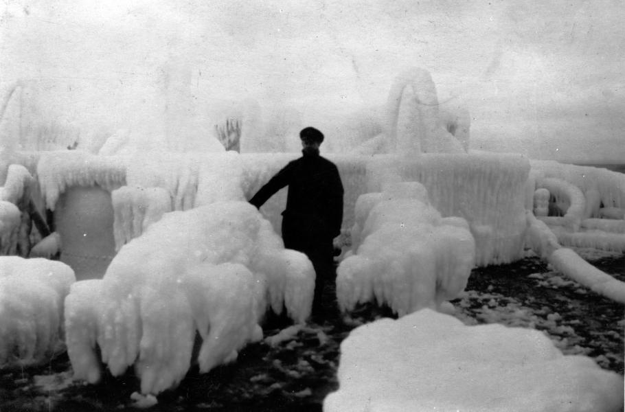 Pohled na zamrzlou palubu bitevní lodě HMS Anson během její služby coby doprovod arktických konvojů.