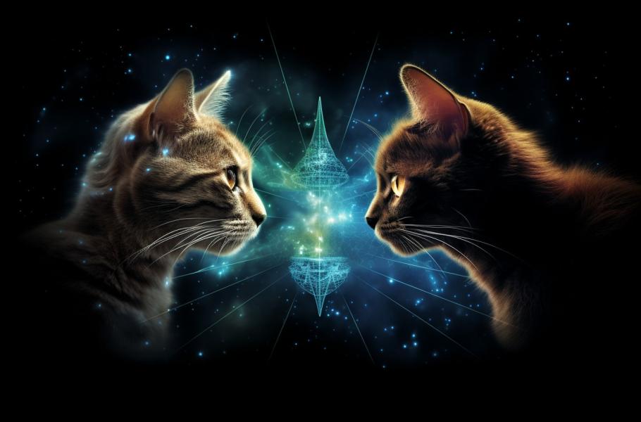 Podle mnohasvětové interpretace existují dva vesmíry. Liší se tím, že v jednom je Schrödingerova kočka živá a ve druhém mrtvá. (ilustrace: Midjourney AI, PDM 1.0)