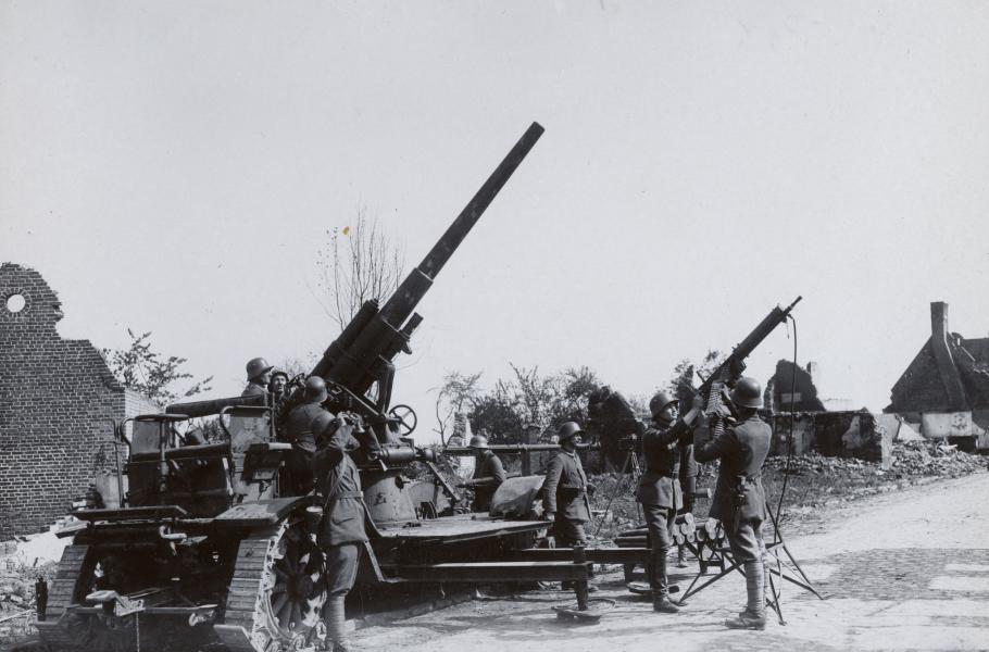 Obsluha na snímku čeká na nepřátelské letouny připravená k palbě, pozorovatel prohlíží oblohu s dalekohledem. Pro správné nastavení roznětky granátů musela obsluha znát výšku blížícího se letounu, k čemuž sloužily stále přesnější dálkoměry. Ochranu proti nízkoletícím cílům poskytoval například těžký kulomet MG 08. Slabší ráži a menší dostřel v porovnání s kanony kompenzovala vysoká kadence.