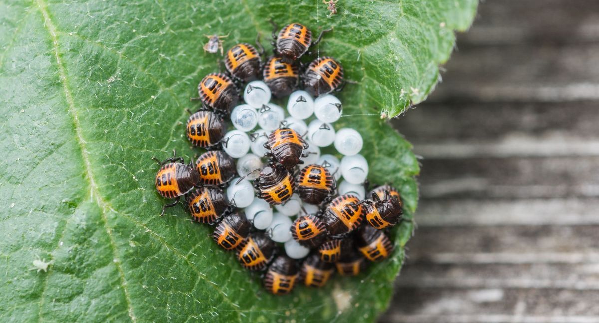 Čerstvě narozené nymfy kněžice mramorované se zbytky skořápek. Za 35 až 45 dní se nymf vyvinou dospělí jedinci. (foto: Shutterstock)