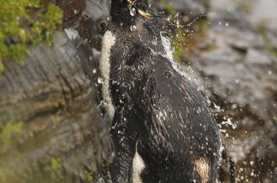 Další zajímavou součástí zvyků tučňáka skalního je tendence vyhledávat na skalních útesech drobné vodopády nebo místa, kde skapává voda. Tam mají ve zvyku smývat si slanou vodu nebo se zbavují nečistot z kolonie. V kolonii The Rookery na Saunders Island nabízelo jedno takové místo výborné příležitosti k pozorování. „Sprcha“ se totiž nacházela na zajímavé skalní lavici, která byla těžce přístupná jak lezecky, tak orientačně. Jen zřejmě ti nejzdatnější nebo nejzkušenější tučňáci se na ni dostali. Jak je vidět, i mezi celoživotními skálolezci jsou jak amatéři, tak kovaní profesionálové.