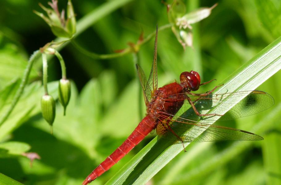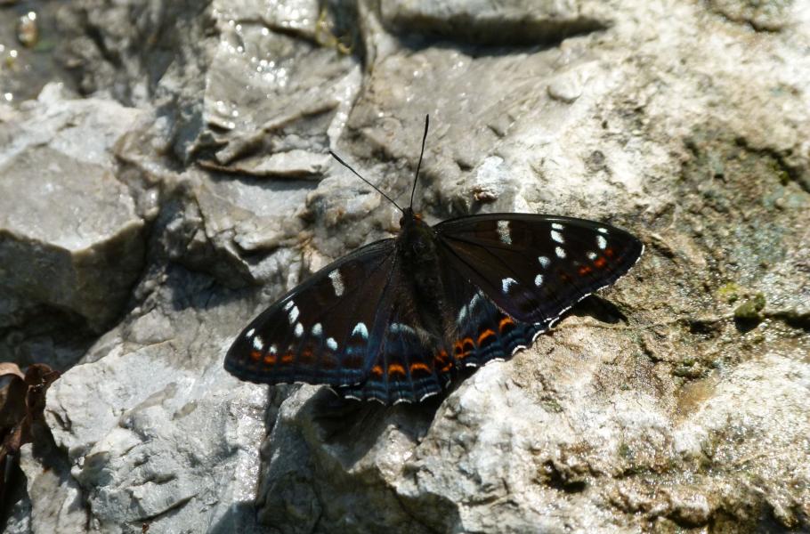 Čekali jsme na batolce hodiny, dny… Sameček se však ukázal vždy jen na chvilinku, okamžik sál vláhu a zase zmizel v korunách stromů. Ještě, že bylo co pozorovat v okolí. V pobřežním podrostu se vyhříval sameček vzácné karmínové vážky červené (Crocothemis erythraea) a jako zázrakem se k nám snesla i samička jednoho z našich největších denních motýlů bělopáska topolového (Limenitis populi) s rozpětím až 80 mm.