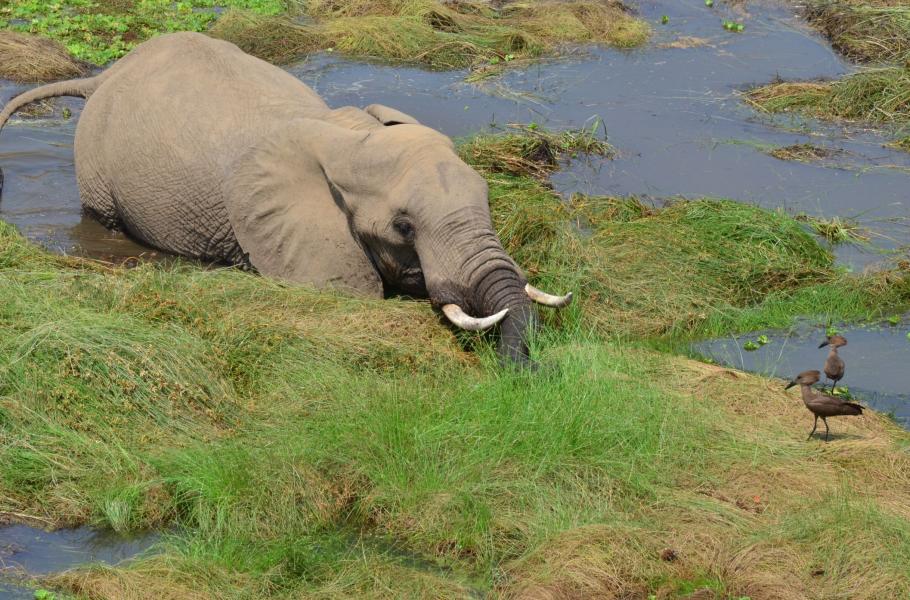 Sloní samice se s velkou oblibou pase na vodních rostlinách. V tomto případě pod dohledem dvojice kladivoušů afrických.