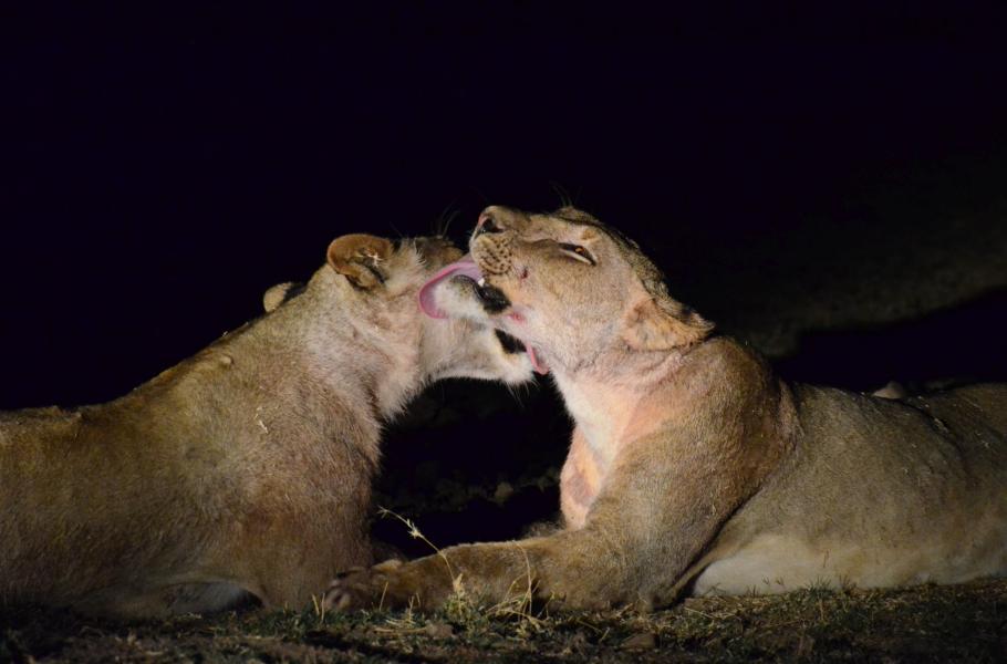 Další večer jsme na horizontu ve světle reflektoru zahlédli dvě malá opuštěná lvíčata. Vzhledem k množství hyen v okolí to bylo dost divné. Asi po kilometru jsme pak objevili skupinu šesti lvic, které požíraly impalího kozlíka. Hostina již téměř končila a lvice si vzájemně důkladně olizovaly zakrvácené mordy. Tenhle úlovek jim asi úplně nestačil, protože další dopoledne jsme stejnou smečku zastihli poblíž strženého buvola. Jedna ze lvic měla zřejmě hlídku a co chvíli se zvedla ze stínu do slunečního žáru, aby odehnala hodující supy. Byla to trochu sysifovská služba – jen kousek poodešla, supi přiletěli zpět.