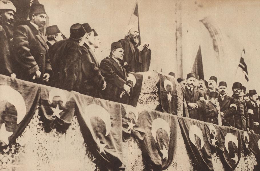 Vyhlášení svaté války před mešitou Fatih v Istanbulu 14. listopadu 1914. (foto: Wikimedia Commons, New York Times, PDM 1.0)
