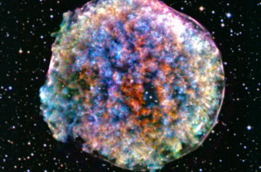 Supernova SN 1572 vybuchla v roce 1572 a zprávu o jejím pozorování podal mimo jiné Tycho Brahe, jehož jméno vzniklá mlhovina nese. Podrobně ji astronomové studovali například v oboru rentgenového záření, kde vzhledem k vysokým teplotám v řádu milionů stupňů září nejvíc. Na snímku lze spatřit strukturu jasných shluků plynu a slabě svítících oblastí. Barevné skvrny představují místa s různou teplotou, tvořená rozličnými prvky: Červená značí plynný křemík, jenž se od nás vzdaluje, modrá naopak páry téhož prvku, které se přibližují.