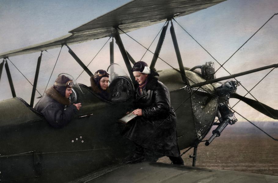 Kolorovaná fotografie zachycuje Jevdokiju Beršanskou, velitelku 588. nočního lehkého bombardovacího leteckého pluku, později proslaveného spíše pod názvem 46. gardový noční bombardovací letecký pluk, udílející osádce poslední pokyny před bojovým letem.