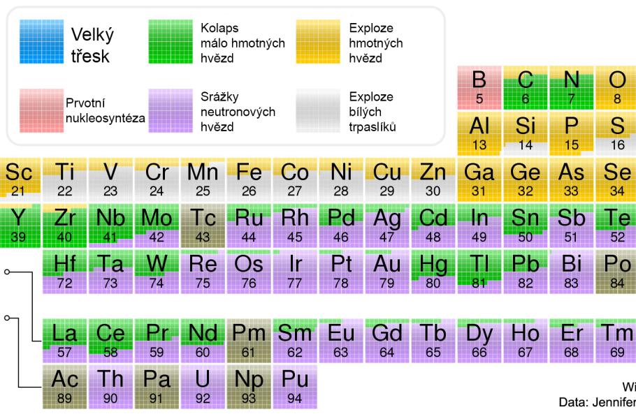 Barevně kódovaná periodická tabulka představuje zatím ty nejlepší znalosti lidstva o původu všech známých prvků. Místa vzniku jader některých prvků, jako je například měď, nejsou dobře známa a jsou trvalým předmětem pozorování a počítačového výzkumu.