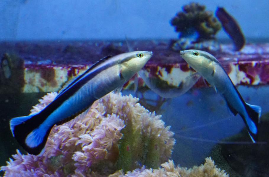 Pyskoun rozpůlený (Labroides dimidiatus) dorůstá délky kolem 10 centimetrů. Žije v mořích od pobřeží východní Afriky až po Pacifik. Živí se parazity, které odstraňuje z kůže jiným rybám. (foto: Max Plant Institute, Alex Jordan, CC BY-SA 4.0)