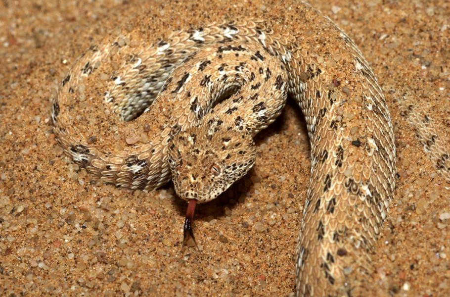 Tommy ukazuje do keříku a opět předvádí čertovské růžky. „Horned viper, rohatá zmije“, objasňuje svoje gesto. Nořím hlavu mezi husté větvičky keře a až po velké snaze vidím hlavu malé zmije. Nechápu, jak ji tam mohl objevit. Je to další druh, česky zvaný zmije pouštní (Bitis caudalis). Tento druh však není tak striktně vázaný na písečnou poušť jako předchozí a žije i v kamenitějších a vlhcích biotopech.