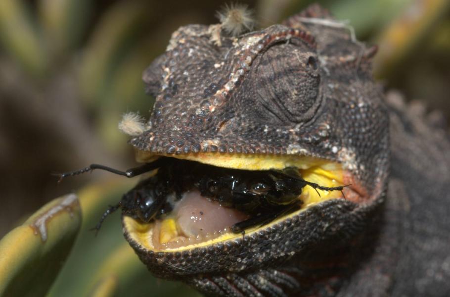 Při cestě sem jsem měl přání vidět také chameleona namibijského (Chamaeleo namaquensis), unikátní druh plaza, který k mému velkému zadostiučinění rovněž neunikl pozornosti našeho průvodce. Tento chameleon není tak pestře zbarvený jako jeho pralesní příbuzní, náš exemplář je skoro černý. Je to jediný opravdu pouštní druh chameleona, který často opouští větve keřů a přesouvá se mezi nimi po písčitém povrchu.