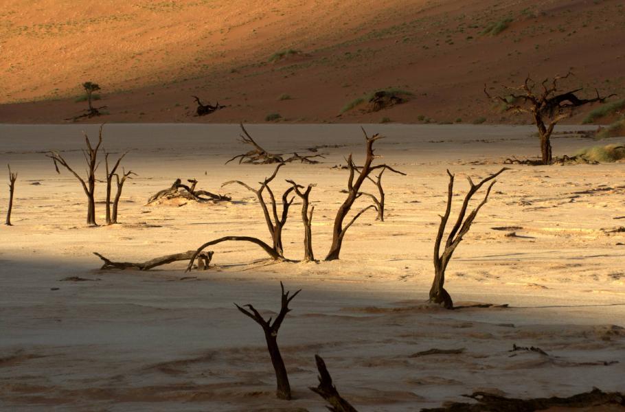 Na konci silnice před dunami je nutné odstavit osobní auto, protože dál se přes písek dostanou jen terénní čtyřkolky. Necháváme se zavézt až před místo zvané Dedvlei, Mrtvé údolí. Po cestě potkáváme přímorožce, velkou elegantní antilopu, která je schopná přežít i v pouštních podmínkách. Pak se už vydáváme přes několik dun do snad nejfotografovanějšího místa v Namibii. Před patnácti sty lety, když vyschly i poslední podzemní zdroje vody a velká duna přehradila říční koryto, uschly i poslední háje akácií a zbyly z nich jen tvrdé pahýly, vypreparované slunce, větrem a pískem.