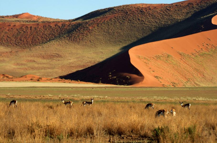 Národní park Namib-Naukluft je s plochou 49 768 km2 nejrozsáhlejším chráněným územím v Africe. Má délku 400 a šířku až 150 kilometrů, navíc se na severu napojuje na národní park Skeleton Coast, jenž chrání dalších 600 kilometrů pobřeží až k angolským hranicím. Na obrovské neobydlené ploše se vystřídá několik biotopů a vegetačních pásem. Větší část parku zabírá kamenitá plošina rozbrázděná koryty a kaňony vyschlých řek. Sporá vegetace však stačí k uživení zvířat, která známe i z podstatně vlhčích savan. A tak kolem silnice často vidíme malá stáda antilop skákavých, přímorožce, skálolezy, pštrosy a dropy.