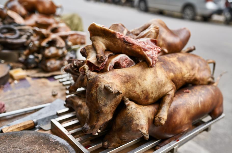 Psi zavěšení ve stísněných a rezavých klecích vysoko nad hromadami výkalů a nakonec usmrcení elektrickým proudem – to je krutost, která konečně začíná pronikat do širšího povědomí. Mnoho zvířat trpí nějakou nemocí a jsou nadopována antibiotiky. Dřív bylo běžné je pověsit a umlátit k smrti v přesvědčení, že to umocní jejich chuť i zdravotní účinky. Zákony na ochranu zvířat však popsané metody do jisté míry zastavily.