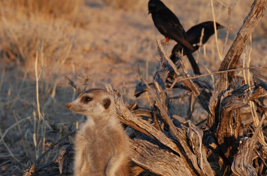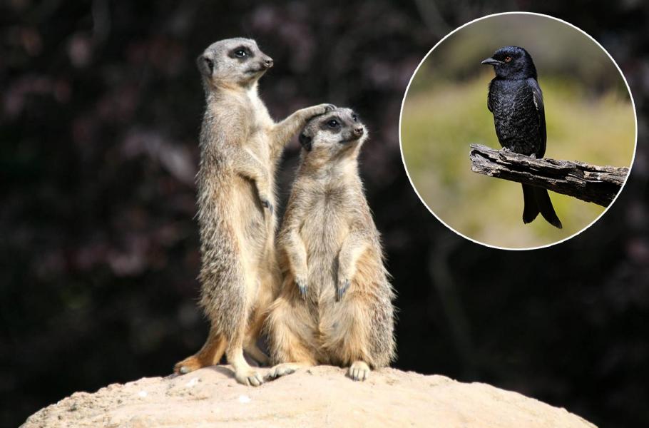 Drongo africký (ve výřezu) někdy plaší surikatu vlastním alarmem, jindy sáhne po vypůjčeném poplachu jiného ptáka.