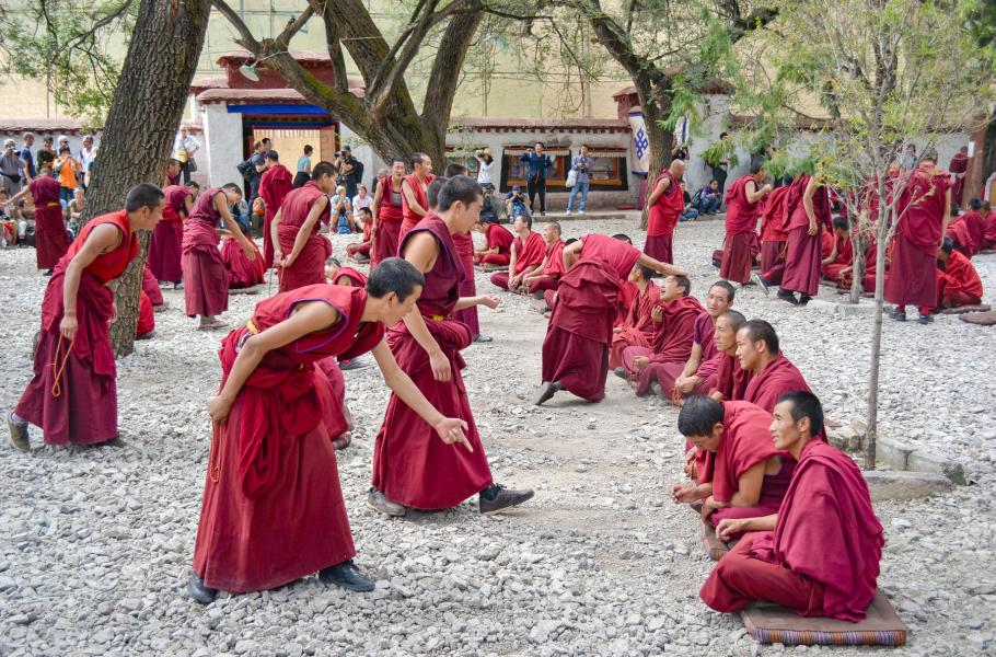 Největší podívanou pro případné návštěvníky kláštera ovšem představují veřejné debaty, jež se obvykle odehrávají na nádvoří. Mniši při nich zaujatě diskutují, a zatímco jeden stojí a pokládá otázky z oblasti buddhistické nauky, druhý sedí na zemi a odpovídá mu. Dialog probíhá za bohaté gestikulace a hlasitého tleskání rukama, tázající často dupe nebo vykřikuje a sedící mu stejně živě oponuje. Debata se nezřídka protáhne na celé hodiny a umění vést podobnou výměnu patří ke klíčovým součástem života tibetských mnichů: Rozvíjí totiž mysl a prohlubuje moudrost i logické uvažování, jejichž pomocí pak student dokáže lépe pochopit Buddhovo poselství.