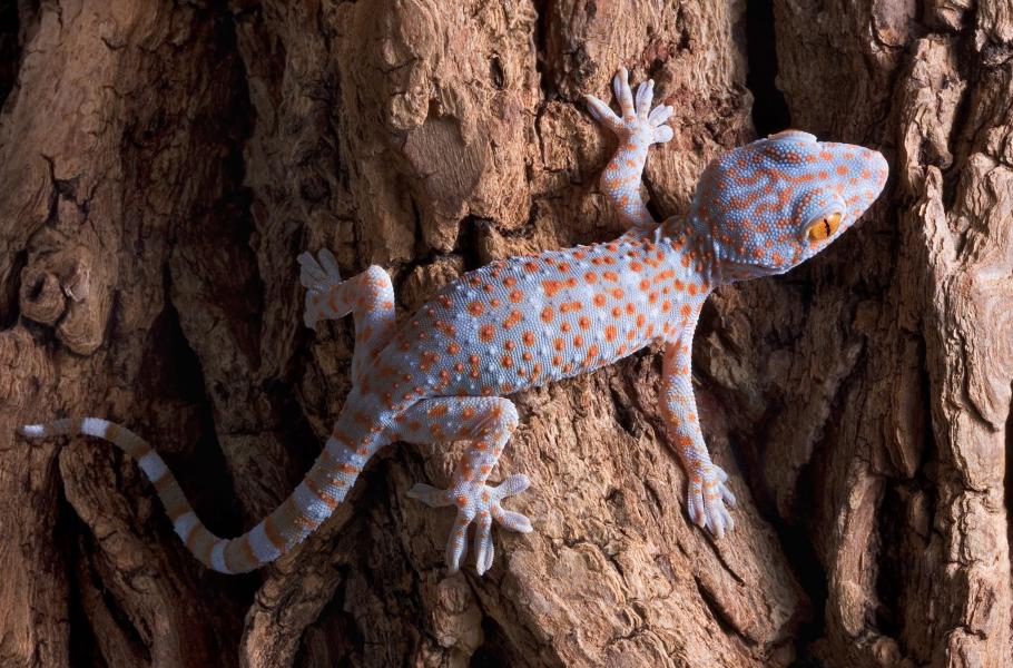 Mládě gekona obrovského (Gekko gecko). Díky nesčetným chloupkům na chodidlech dokážou gekoni bez problému chodit i po stropě. (foto: Shutterstock)