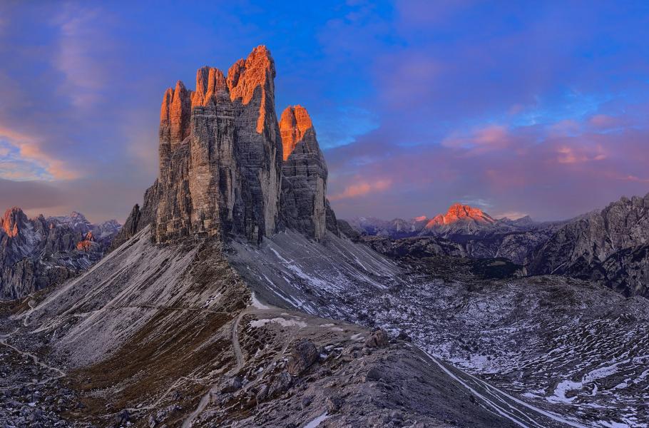 Na snímku je zachycen pohled na Tre Cime di Lavaredo při východu slunce.