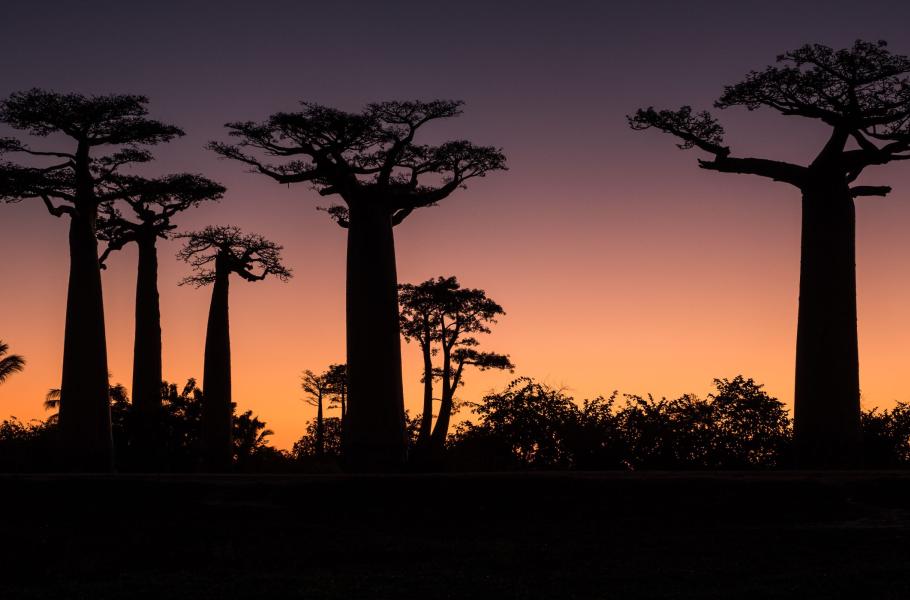 Alej baobabů na Madagaskaru začala po západu slunce hýřit nejkrásnějšími barvami.