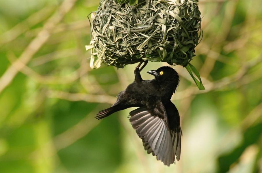 Snovač černý (Ploceus nigerrimus) na svém hnízdě. Foceno v prosinci 2018 v Kamerunu.