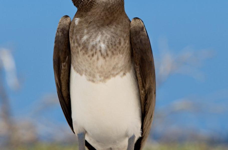 Mladý terej modronohý (Sula nebouxii) hrdě pózuje na „svém“ kousky lávy na galapážském ostrově Seymour Norte. Po dosažení dospělosti se jeho nohy rozzáří sytě azurovou barvou.