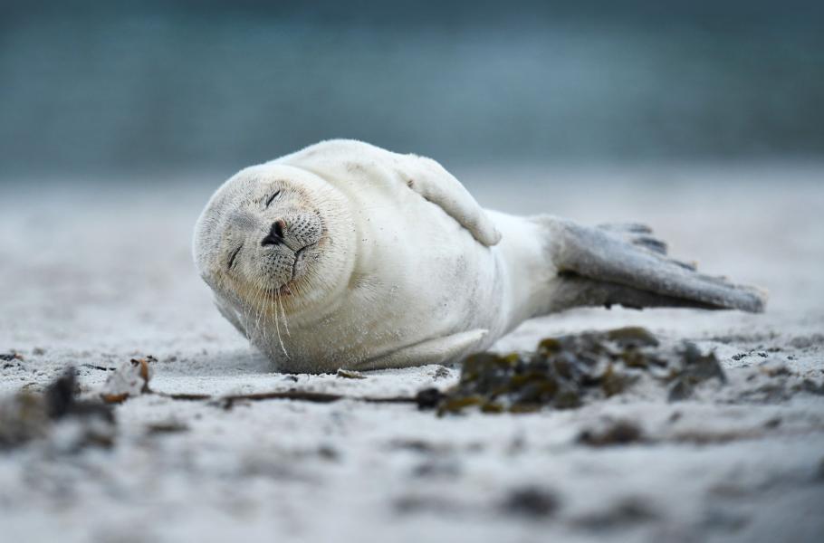 Odpočívající mladý tuleň na pláži ostrova Düne. Prosinec 2018.