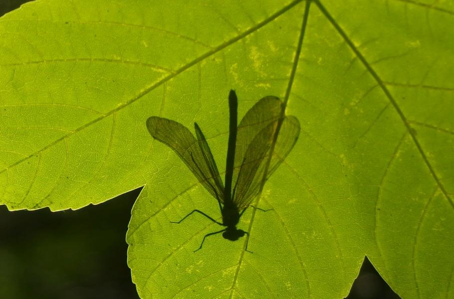 Motýlice obecná (Calopteryx virgo) odpočívající na listu javoru.
