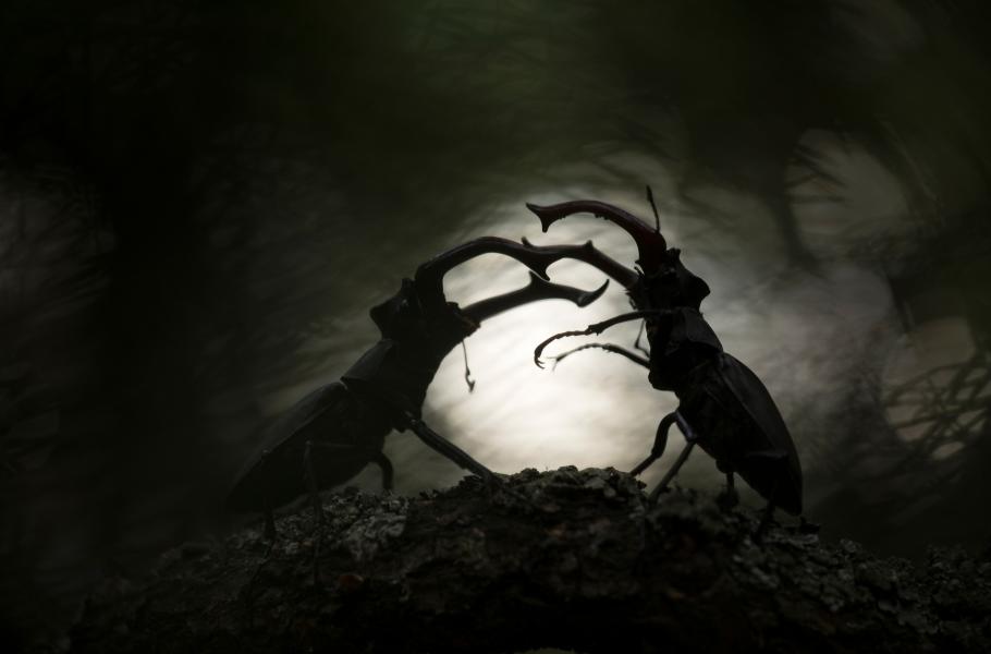 Každé léto se dubové lesy v ruské Voroněžské oblasti stávají bojištěm roháčů obecných, kteří zápolí o právo na páření. Celkový vítězný snímek soutěže přitom zachycuje právě jednu takovou potyčku, zahalenou do dynamické stínohry. (foto: CUPOTY, Svetlana Ivaněnková)