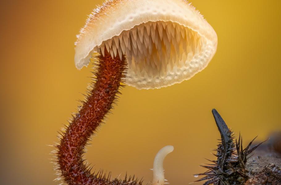Lžičkovec šiškový roste na šiškách borovic a Barry Webb si zmíněnou houbu vybral pro její netradiční, skoro až děsivý tvar. Vyfocený exemplář měří pouhých patnáct milimetrů a pozadí mu vytvořil vhodně umístěný list. (foto: CUPOTY, Barry Webb)