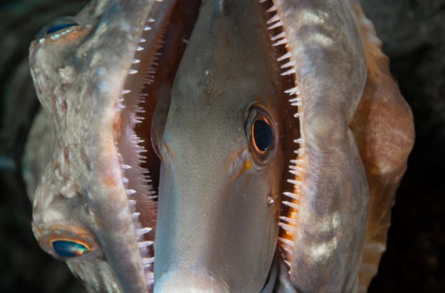 Ačkoliv se zdá, že má bodlok chirurg chycený v čelistech ještěrohlavce pobřežního namále, opak je pravdou. Bodlok totiž tlamu predátora blokuje ploutvemi, takže pro něj situace není nijak vážná – a chvíli po pořízení snímku se ze sevření skutečně vymanil. (foto: CUPOTY, Gabriel Jensen)