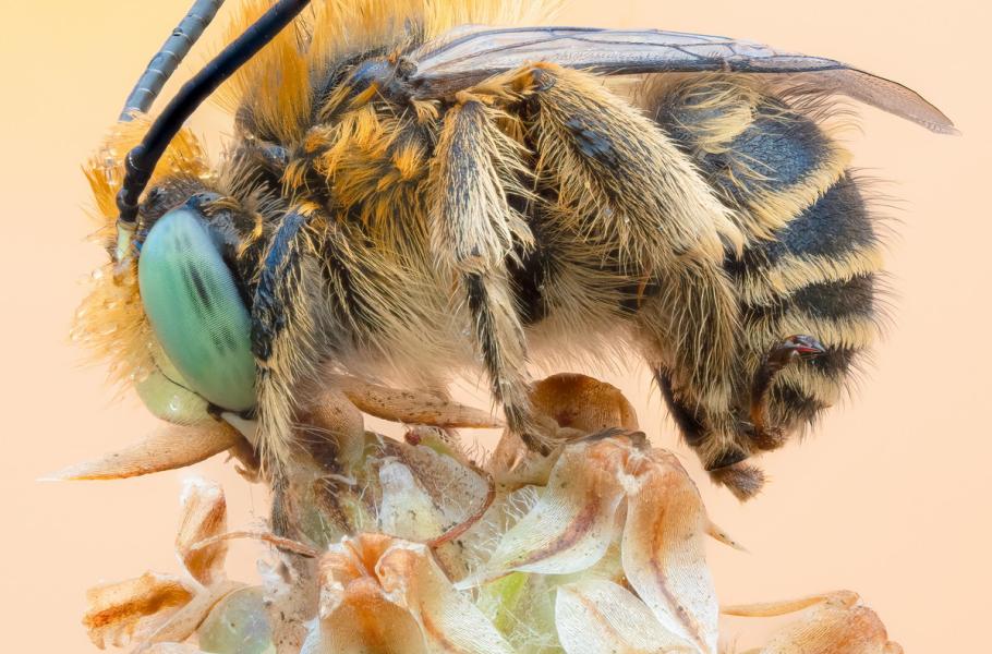 Některé zelenooké včely Anthophora bimaculata se na noc nevracejí do hnízda a raději si vyhledají místo ke spočinutí venku. Zvěčněnou krásku tak John Plummer našel jednoho chladného rána odpočívat přímo na květině. (foto: CUPOTY, John Plummer)
