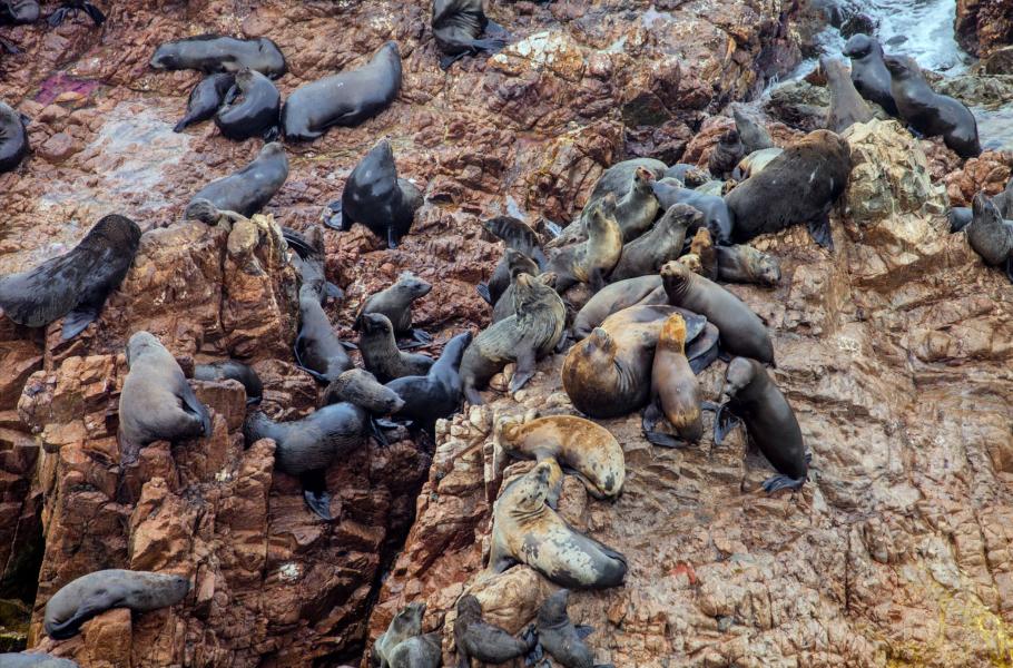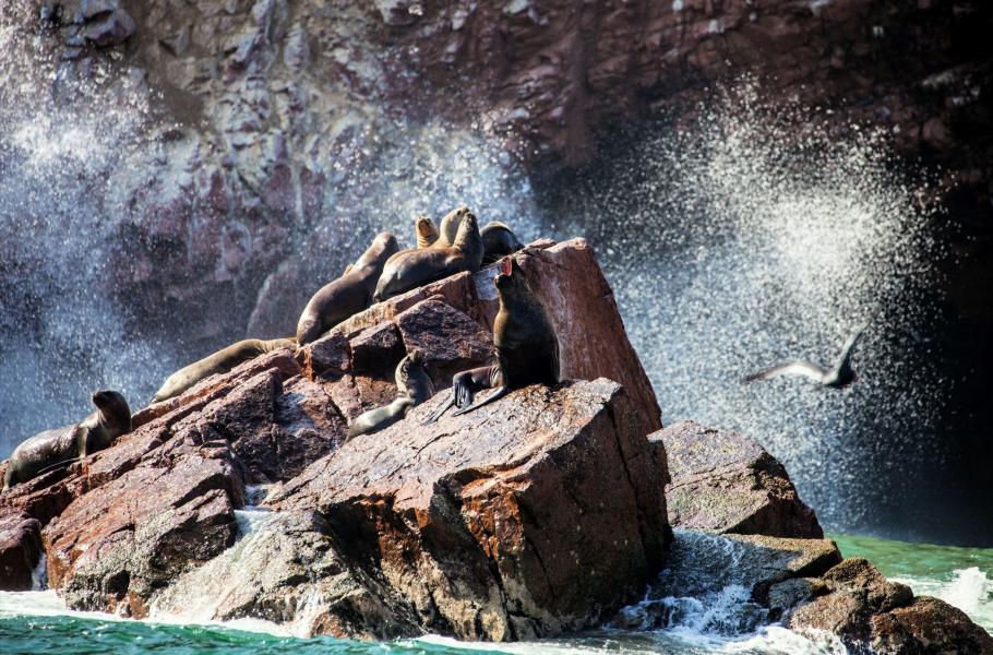 Pacifik je neklidný a čluny se pomalu proplétají mezi útesy za neustálého pohupování. Udělat solidní snímek není za těchto podmínek vůbec snadné. Prý ale máme štěstí, někdy bývají takové vlny, že čluny vůbec nemohou vyplout. Na skalách se povalují lachtani hřivnatí (Otaria flavescens), je až neuvěřitelné do jaké výšky se dokážou vyšplhat. Na velké pláži hlídá několik samců velké harémy, spousta mláďat dovádí na mělčině. Na velkou skálu se neobratně drápe malá skupinka tučňáků Humboldtových (Spheniscus humboldti).