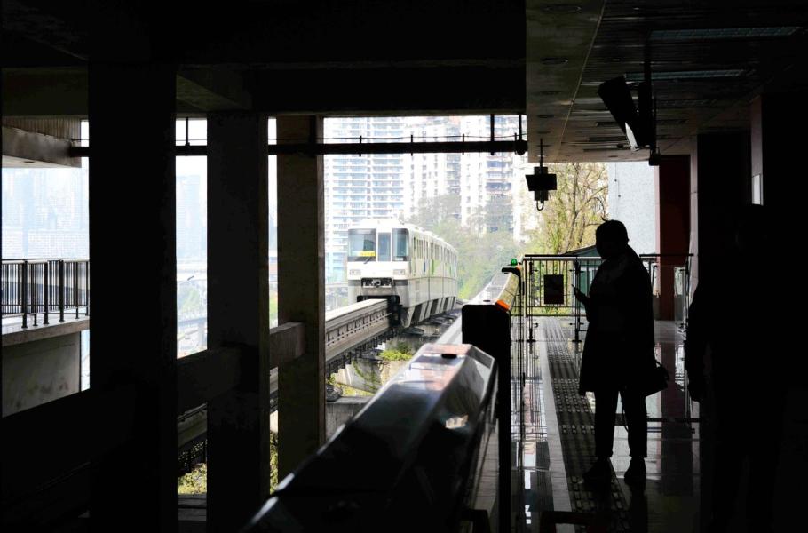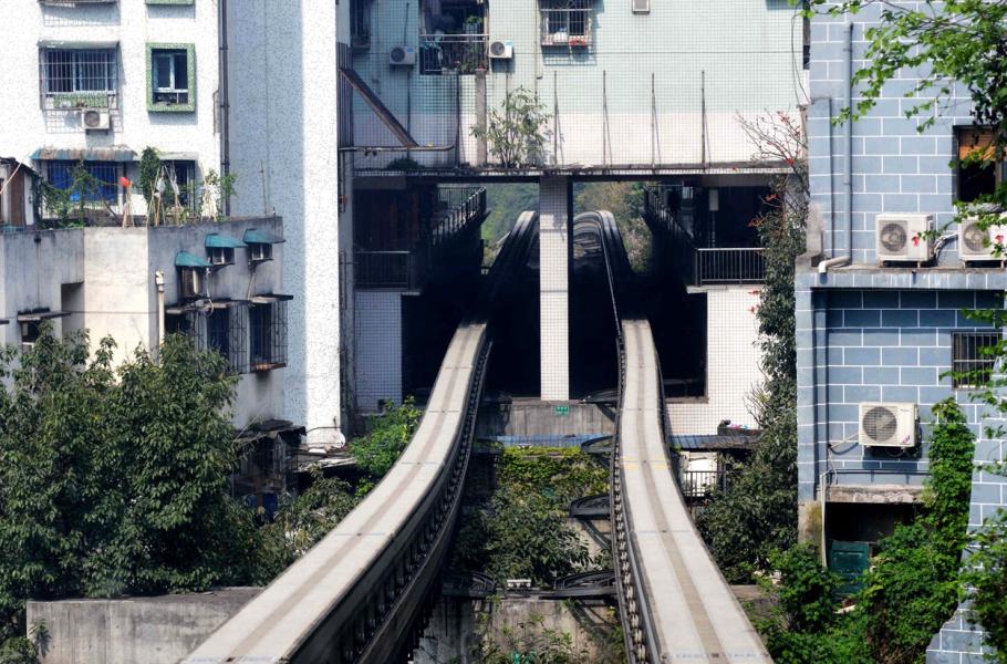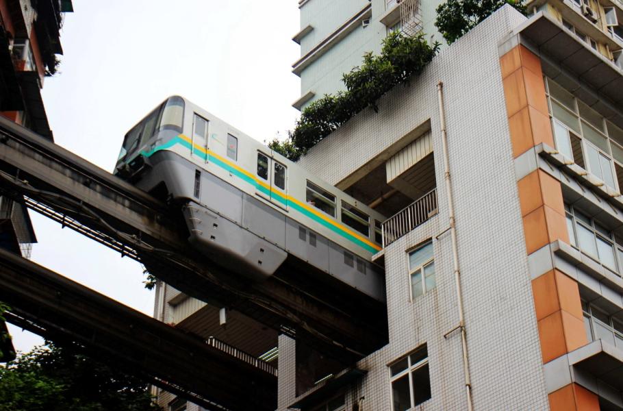 Rezidenční čtvrti ve městě Čchung-čching se kvůli velmému počtu mrakodrapů a dalších výškových staveb přezdívá Mountain City. Vyprojektovat v takto husté zástavbě trasu jednokolejky je pořádná výzva pro nejednoho architekta.