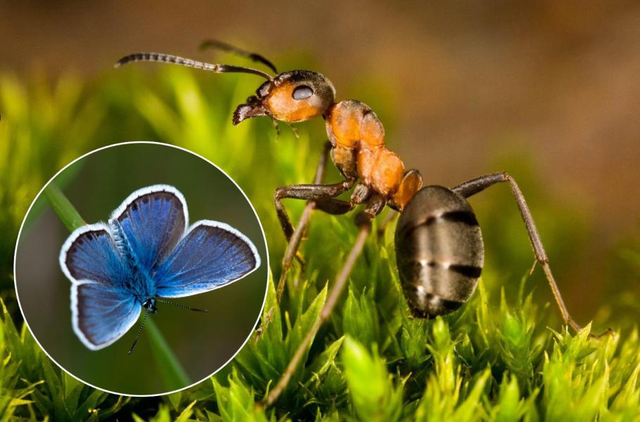 Některé druhy modrásků by měly bez péče mravenců jen mizivou šanci na dokončení vývoje. Například z housenek modráska Glaucopsyche lygdamus (ve výřezu) dokončí bez přispění mravenců vývoj jen desetina ve srovnání s housenkami, o které mravenci pečují.
