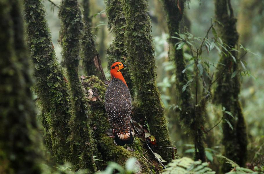Jsme v rezervaci Eaglenest ve východní Himálaji v indickém svazovém státě Arunačalpradéš, v mlžném lese ve výšce asi 2 500 m n. m. Zvuk, který právě posloucháme, je volání samce satyra Blythova (Tragopan blythii), krásného a extrémně vzácného druhu bažanta. Khandu mě nemusí dvakrát pobízet, abych nechal samičku trogona být a vyrazil okamžitě za satyrem. Opatrně našlapujeme hustým podrostem, čas od času se zastavíme a špicujeme uši, odkud se satyr ozve příště. Najednou ho zaslechneme hrabat v listí kousek od nás, skoro přestáváme i dýchat a veliký rudo-šedý kohout vyskočí na kámen v mechu jen pár metrů před námi. Mám ho krásně v hledáčku, ale autofocus v šeru lesa a hustém podrostu jen bezradně přeostřuje dopředu a dozadu.
