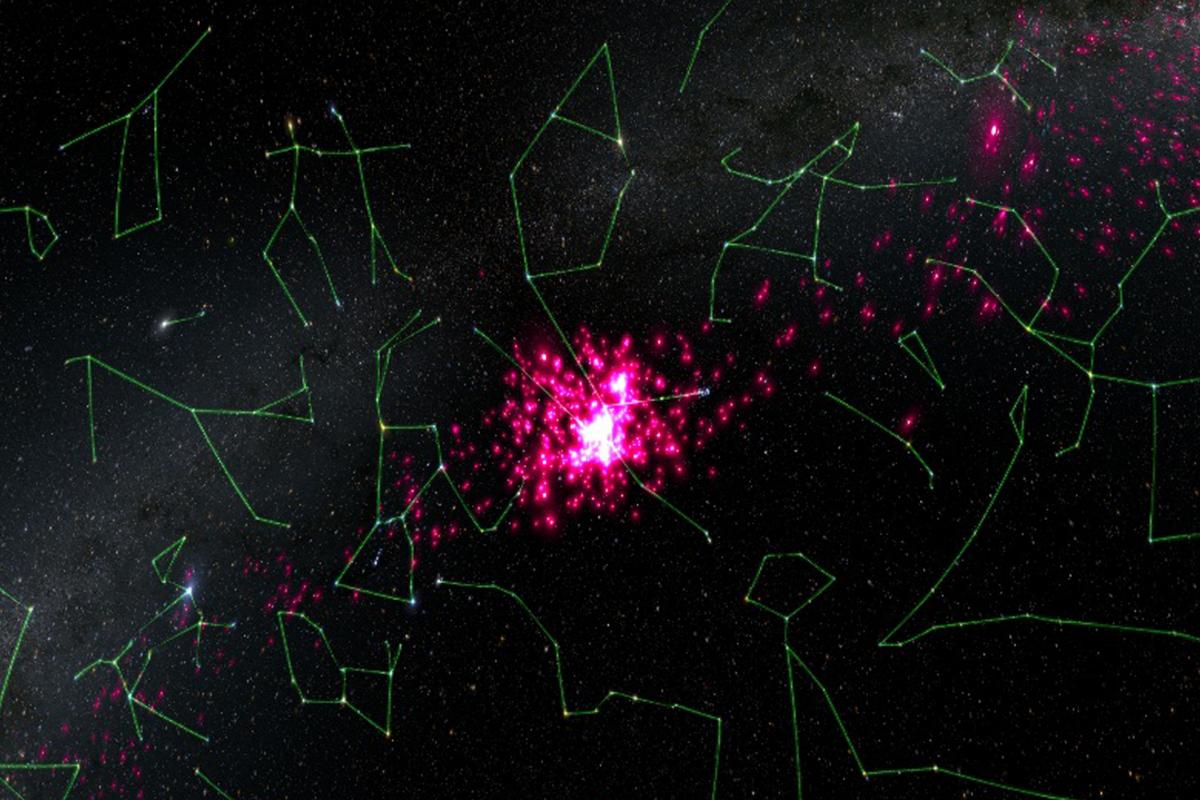 Data získaná družicí Gaia umožnila odhalit skutečný rozsah slapových ohonů a dohledat bývalé členky hvězdokupy Hyády (růžově). (foto: ESA, Gaia, DPAC, S. Jordan/T. Sagrista, CC BY-SA 3.0 IGO)