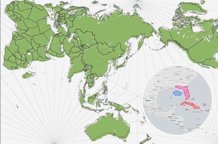 Svět podle Japonce Hadžimeho Narukawy. Ve výřezu skutečná velikost České republiky, pokud by se nacházela v Mexickém zálivu.