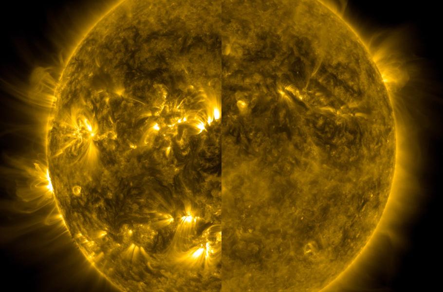 Srovnání sluneční aktivity pozorované observatoří Solar Dynamics Observatory (SDO) v říjnu 2010 a 2012. Vlnová délka snímků je 171 angstromů