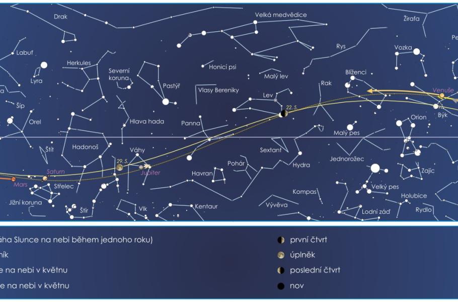 Právě v květnu přitom nastávají ideální podmínky pro pozorování Jupitera. Gigant se totiž 9. května ocitne v opozici se Sluncem, což znamená, že vychází současně se západem naší denní hvězdy a můžeme jej sledovat po celou noc v souhvězdí Vah. V tomto období kulminuje zhruba hodinu po půlnoci nad jižním obzorem v úhlové výšce 24°.